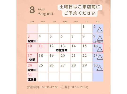 2025/08/018月の営業日をご案内します。 10日~17日はお盆休みとなりますのでご注意ください。 それに伴い9日は12時までの営業となります。 8月はたくさ... -